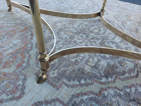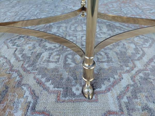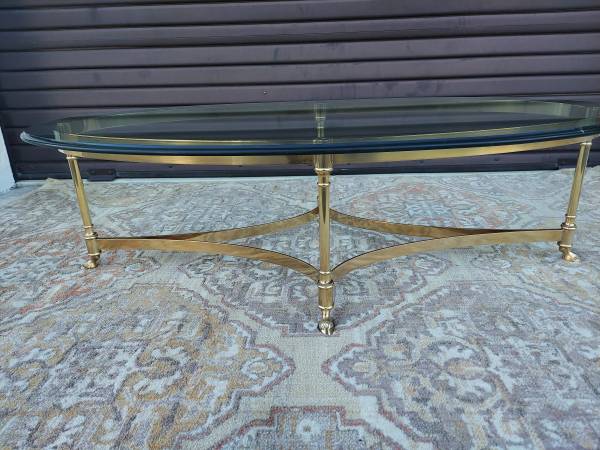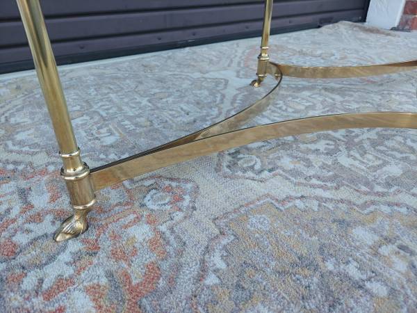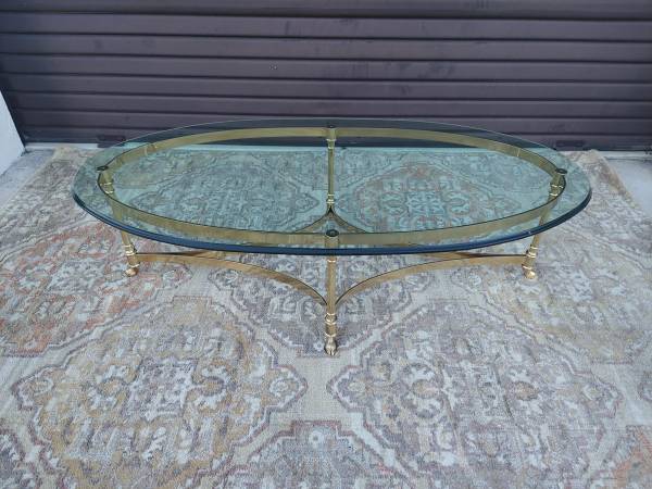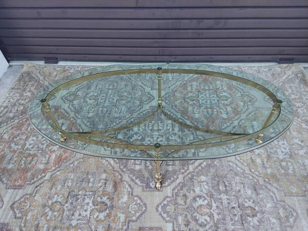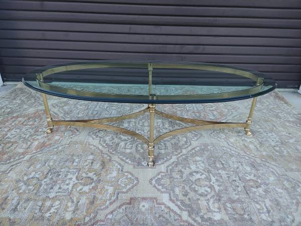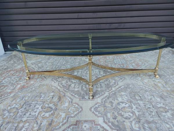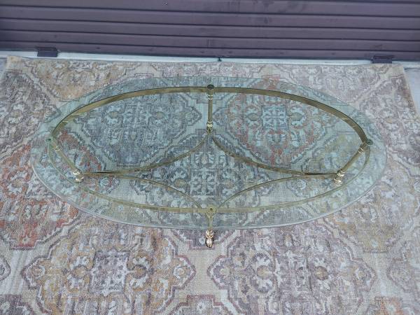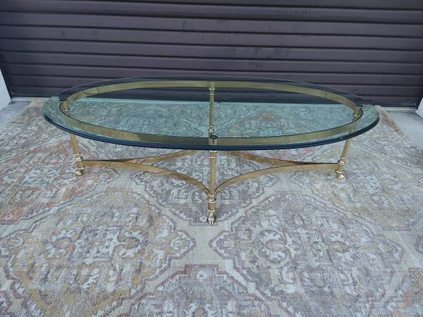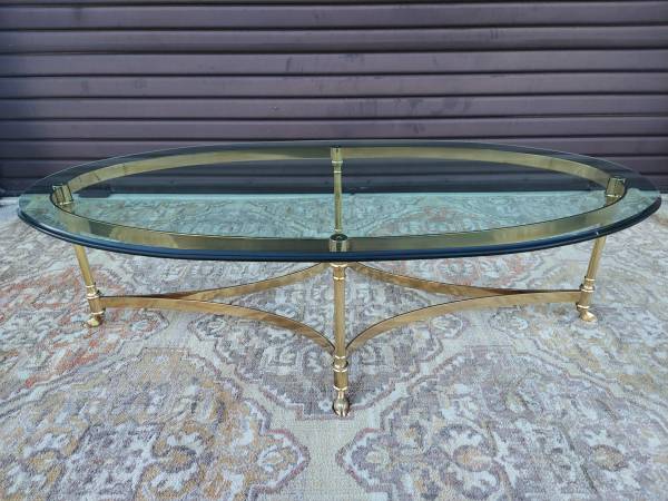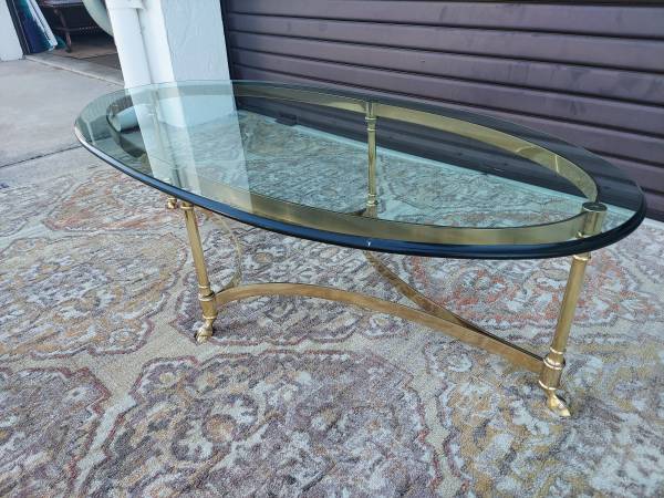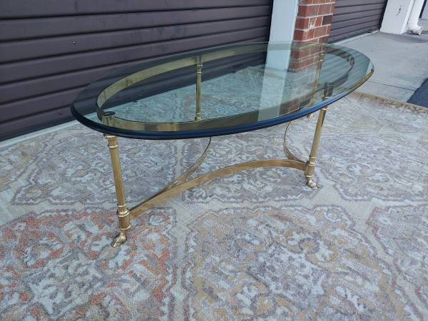 Vintage Hollywood Regency Brass Oval Coffee Table ( La Barge ) Glass Top and Hoof Detailed Feet - Classic / Hollywood Regency Style - Would Look Beautiful In Any Space - Very Good Quality and Condition - Original Patina to Brass - Glass Exceptional Condition - From Non Smoking Home. Measures 55" Long x 23" Wide and 17 1/4" Tall. Price $595.00. Cash Only. For More Info Call 386 eight four eight six two two 4 or Text.