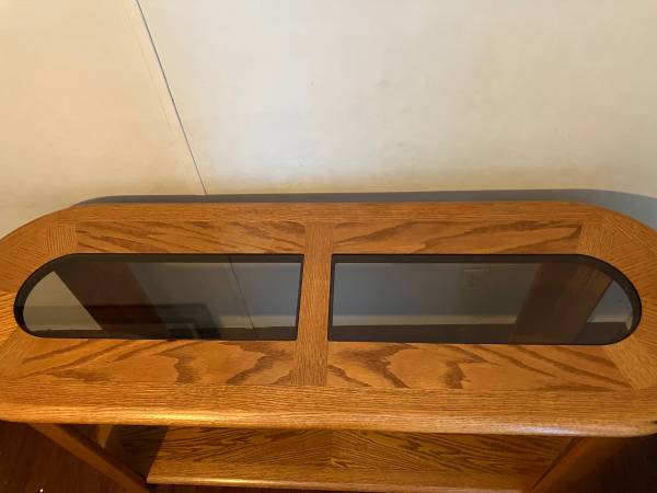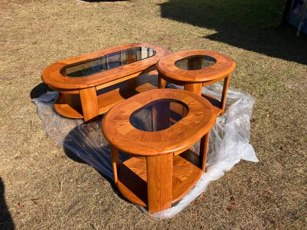 Solid wood, light in color. 2 end tables 1 coffee table 1 tv/ multifunctional table. Each piece with smoky glass as seen in pictures. Nice furniture for a low price; I have downsized and do not have...