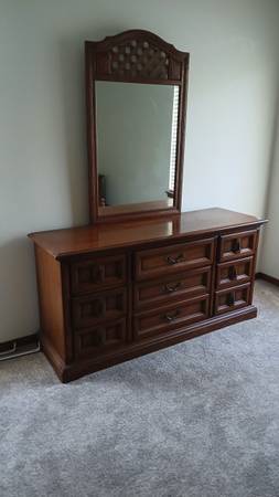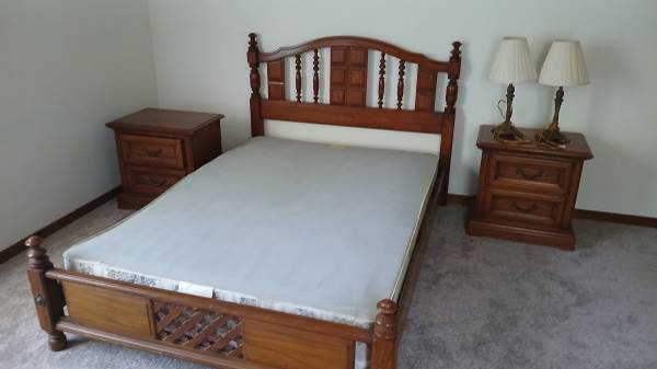 Like new twin/queen bed, dresser . mirror, two night stands and lamps