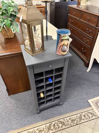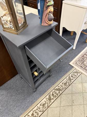 FEATURED ITEM(S): Dark Gray 18 Bottle Wine Cabinet, With 1 Drawer, $95.00, 16"x 14"x 34"
