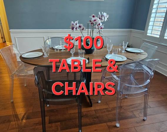 Dining Table and Chairs Furniture Set Oval Dining Table with Chairs 77 long x 44 wide x 29 high Includes 6 chairs. VERY STURDY ROBUST table. Will help move. From non smoking pet free home.