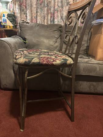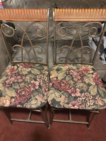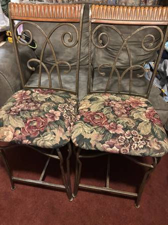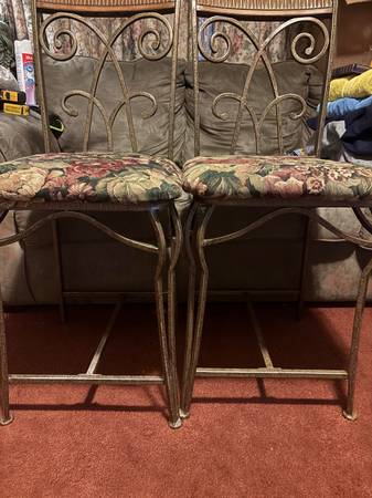 TWO MATCHING COUNTER OR BARSTOOLS. WROUGHT IRON AND WOOD PADDED SEATS. DIMENSIONS PAD 17x17. FLOOR TO SEAT 23 INCHES FLOOR TO TOP OF STOOL 41 INCHES $20 FOR BOTH