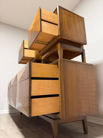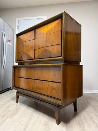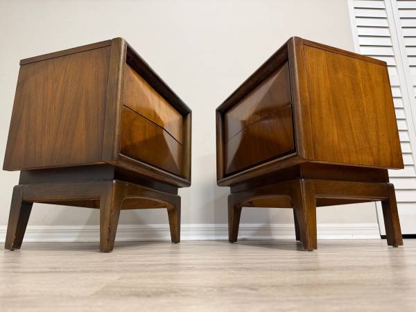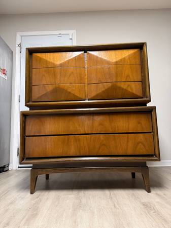 Gorgeous diamond front design. These things were built like tanks! Crafted from all high-quality solid wood. Extremely sturdy. Beautiful walnut veneer.