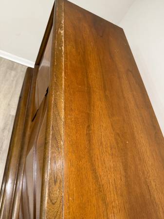 This bedroom set is still in perfect functioning condition. But it has been well loved. It’s hard to tell from the pictures, but there are a lot of signs of wear on the top surface finish. The wood is not damaged at all. It’s just that this set has been well loved and there’s a lot of signs of traffic on the surface. Lots of tiny little marks and blemishes.