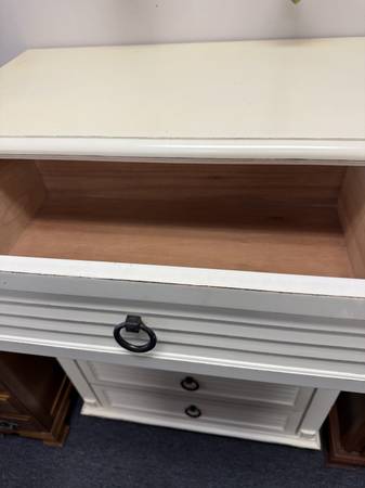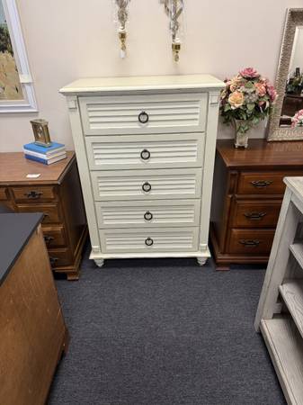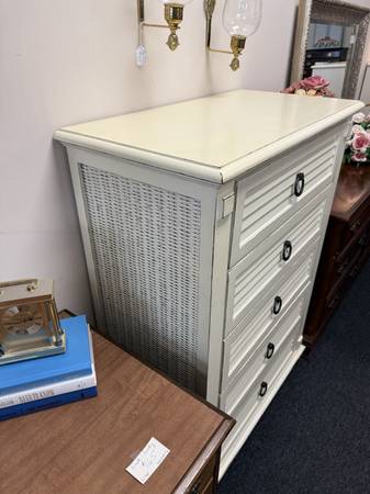 FEATURED ITEM(S): Off White Wood Wicker Chest Of Drawers, $195.00 26"x 40"x 30"