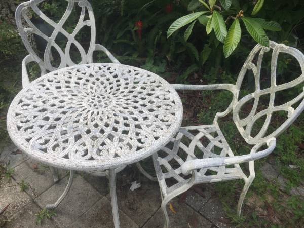 Outdoor bistro set for sale. Table is 30 inches in diameter and 28 inches tall. Very sturdy. Quality aluminum set. Needs pressure washing and painting. I live off Beach Blvd. and Hodges Blvd. Call