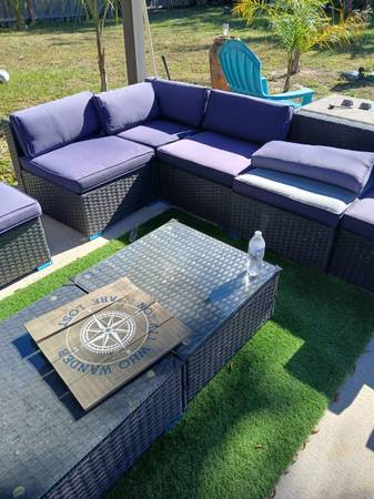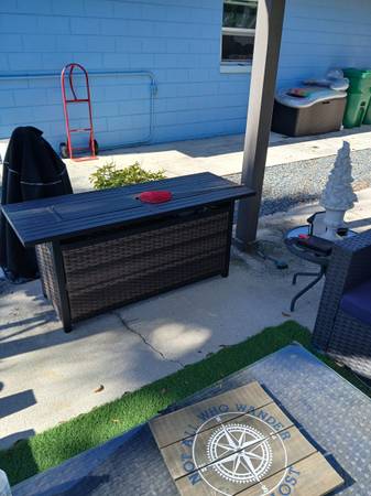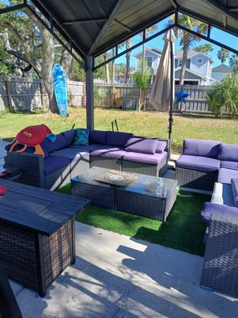 Great looking outside patio/pool side 13 piece set up, complete with fire table and propane gas canister, barely used. Good deal for someone. We are moving out! I am in Jacksonville Beach, pick up...