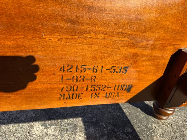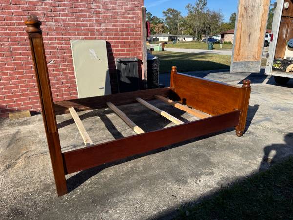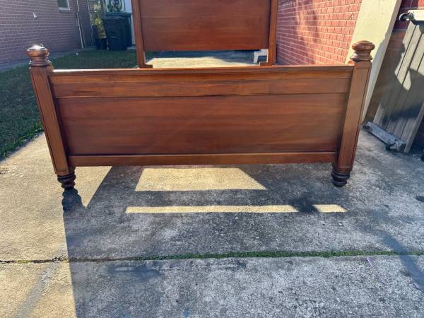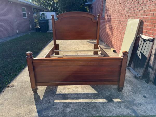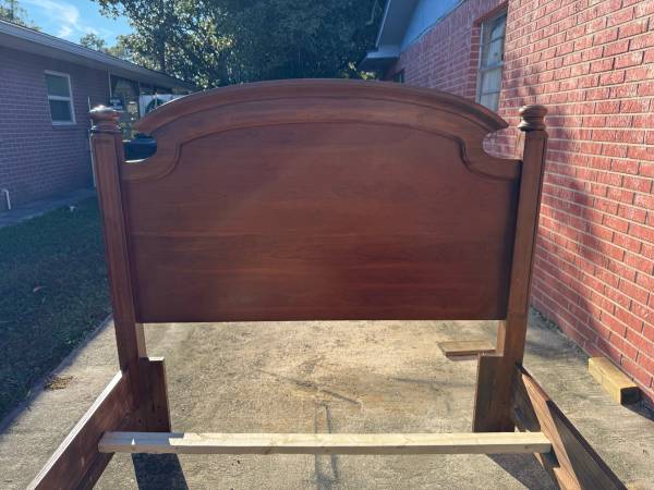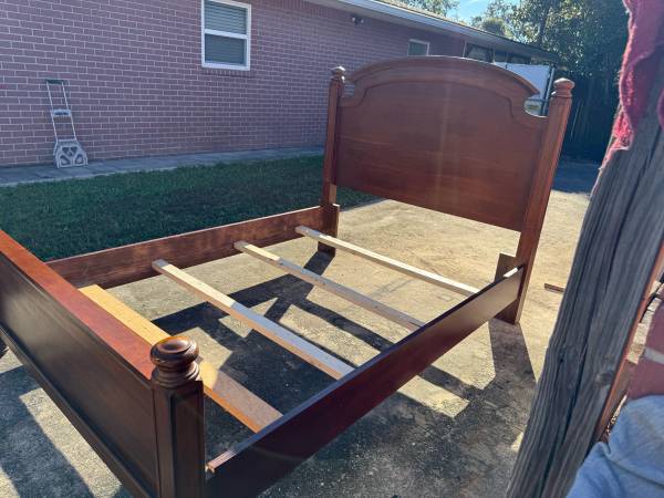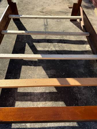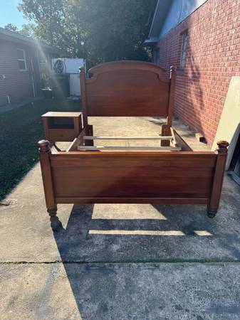 Bed & nightstand are in very good condition… Strong and sturdy… Very minor ware… Made of walnut wood… Railsnare cherry(hooks are correct)… No breaks or cracks… Brown around back is stain… Comes with metal side rails and 3 metal bed slats … Fits queen or full bedding… Rails are queen size which are also used for full size setting… Nightstand is made of oak… Both drawers work good… Bed measures 90”L x 65”W x 55.5”H(headboard) x 30”H(footboard)… Nightstand measures 21.5”W x 16.5”D x 23”H… All offers are considered… I meet my customers for pickups till 8pm… Delivery & set up available… I accept cash,Venmo or PayPal…