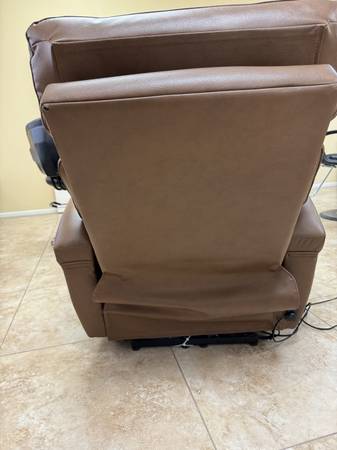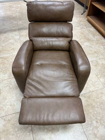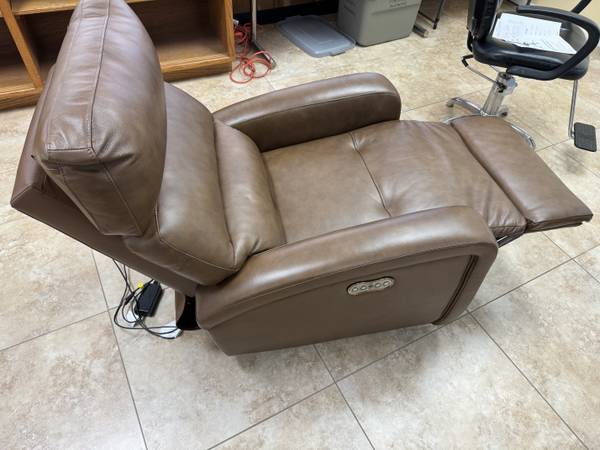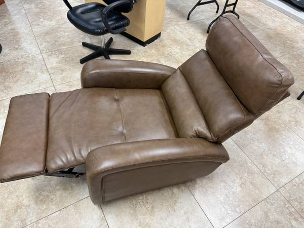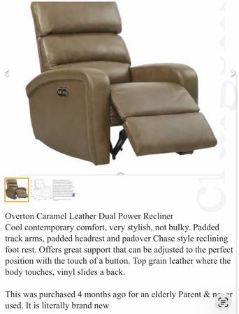 Cool contemporary comfort, very stylish, not bulky. Padded track arms, padded headrest and padover Chase style reclining foot rest. Offers great support that can be adjusted to the perfect position with the touch of a button. Top grain leather where the body touches, vinyl slides a back.