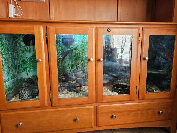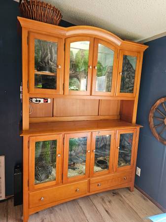 Custom made reptile enclosure. Converted hutch cabinet with two large snake enclosures. All glass front for easy viewing, heat pads with thermostat, LED lights, custom made hides, and multi-level for enrichment. 60" wide, 79" tall, base 18" deep, top 13" deep. Sold wook. Moving into a smaller house and this cabinet is just too big. Message me for more photos and details.