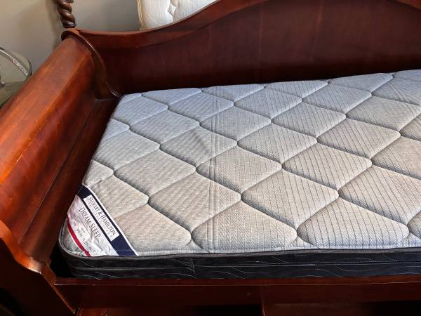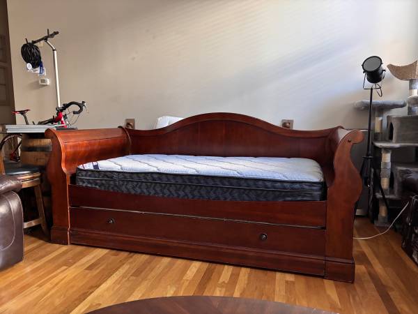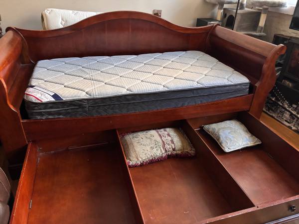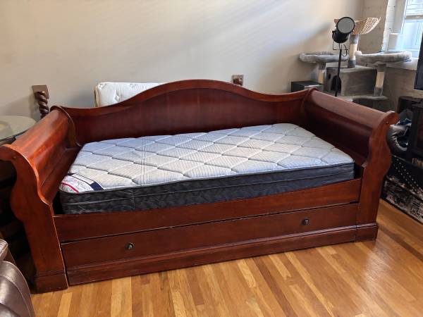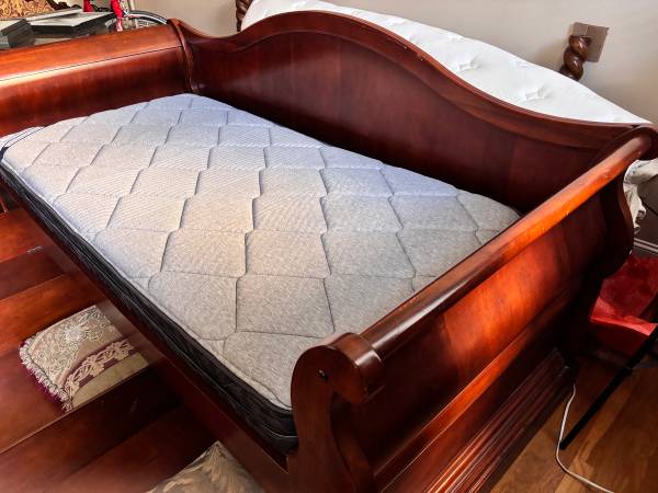 Rustic Walnut sleigh daybed for living room or guest bedroom. Overnight guests will love sleeping in this solid wood sleigh daybed with its curved sides, gracefully arched back, and decorative feet. The trundle has smooth casters that easily glides out to accommodate two overnight guests. Trundle fits two 8” (standard mattress) or has two solid cherry wood slats for