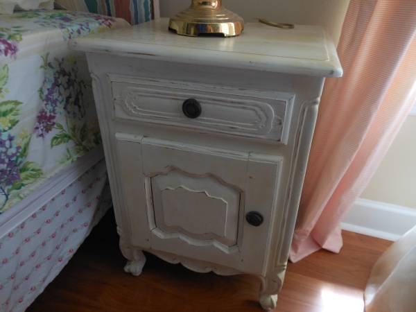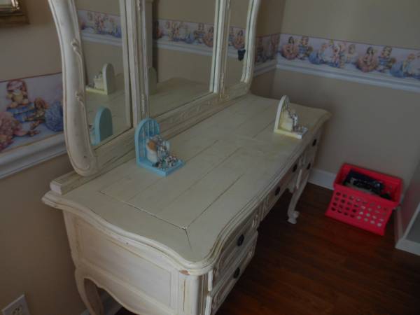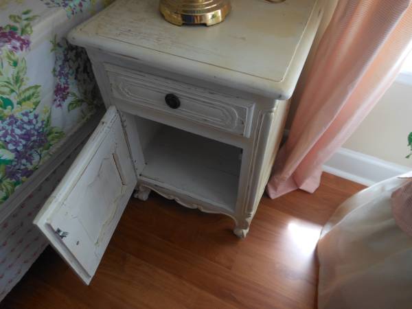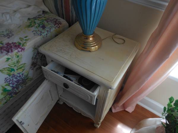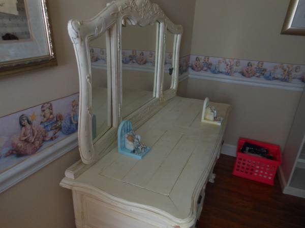dresser with mirror, chair and a night stand.