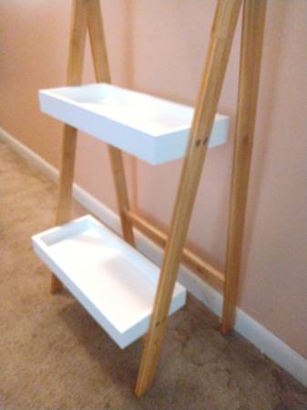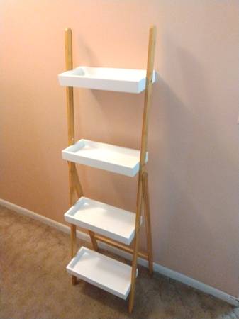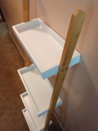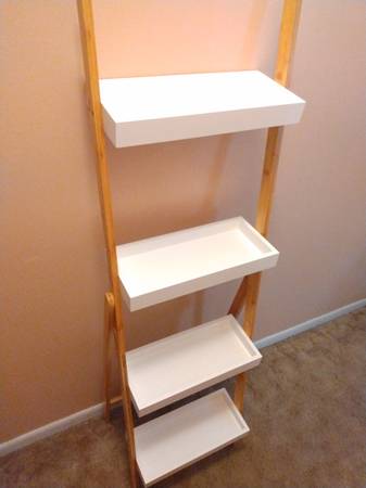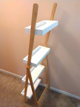 - Leaning ladder-style shelf with a bamboo frame and tiered MDF trays