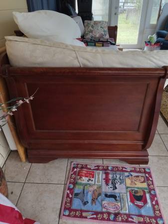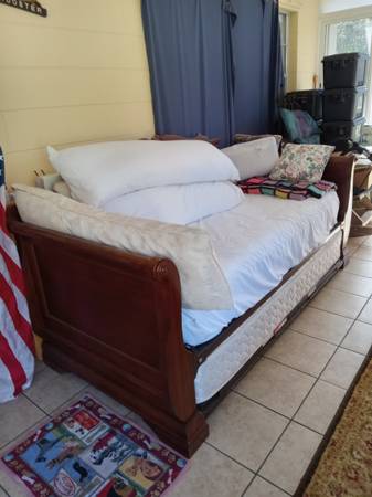 Sleigh Style Day Bed with Mattresses. Not sure of the Brand but my mother always purchased top products. So I am unsure if it is Thomasville or who it is made by. Did not see a manufacturer sticker on the piece. Comes with 2 mattresses in good condition.