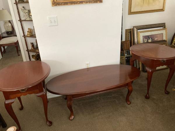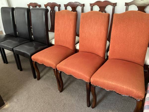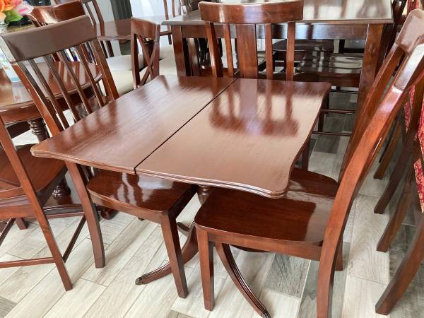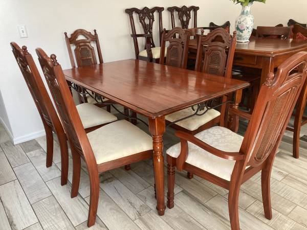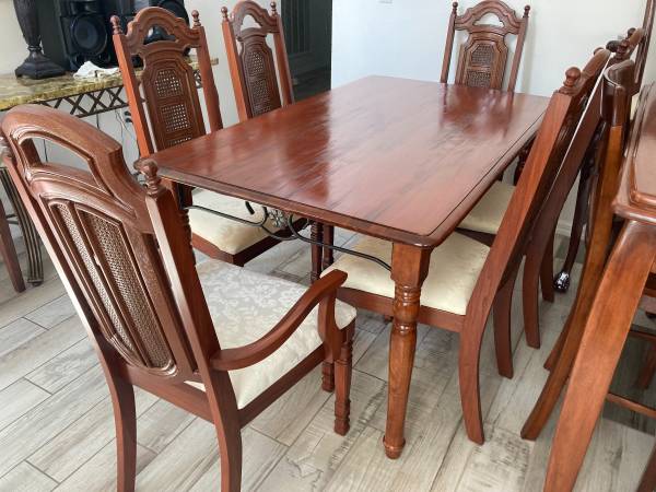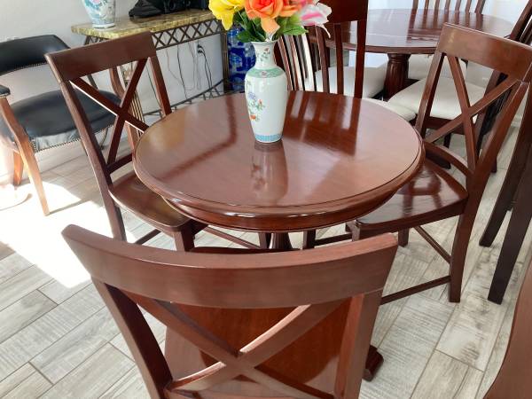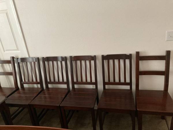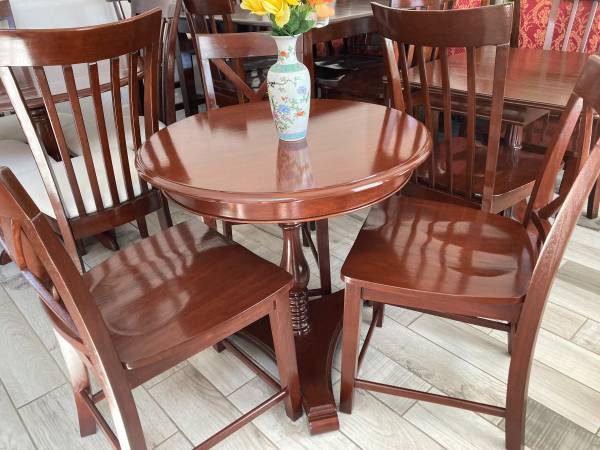 Solid wood dining table with 6 chairs $400 Solid wood round table with 3 chairs $200 Solid mahogany porker table with 2 chairs $180 Dark solid wood table with 6 chairs $400 4 solid oak chairs with...