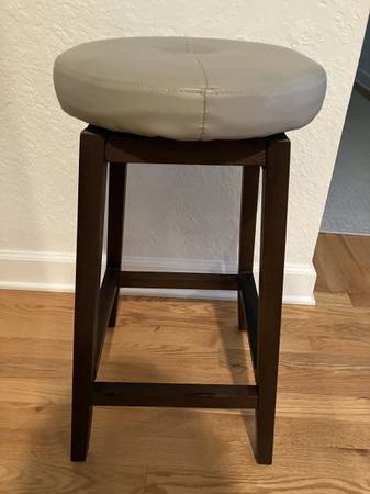Swivel bar stool in great condition. Size: 25"HX14"WX14"Dia. Solid wood frame with swivel leather seat.