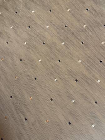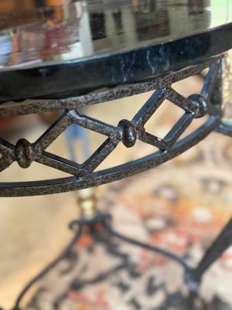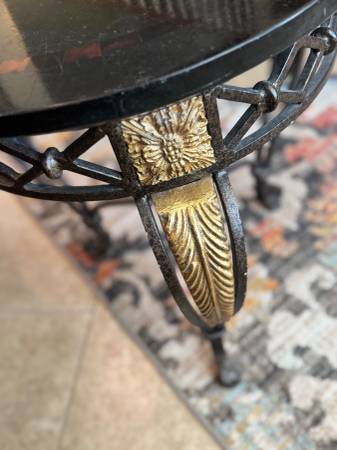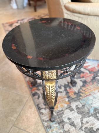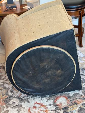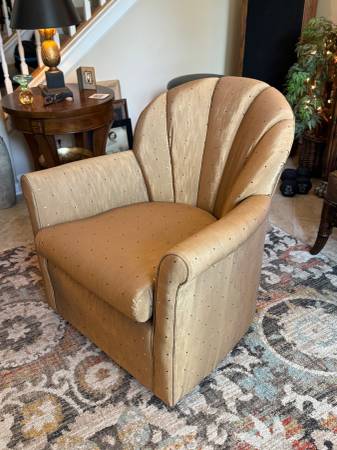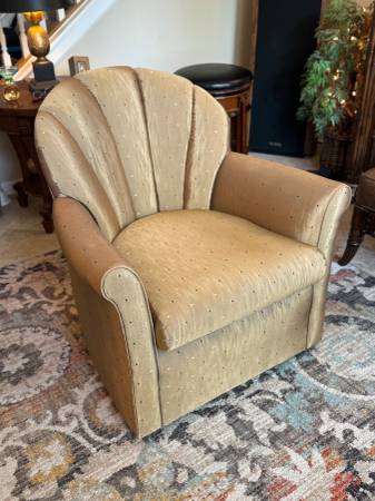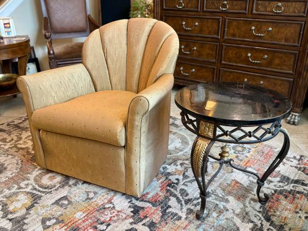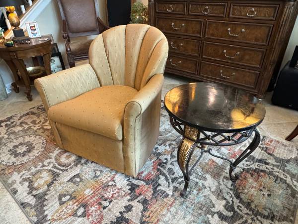 Beautiful combo of a comfortable swivel chair and graceful side table. Both are smaller than standard sized items… perfect for smaller stature… our grandmother, for example, was just under 5 feet tall and when seated her feet would comfortably touch the floor. Lovely textured fabric and a firm swivel action. Chair: 18” floor to seat.
