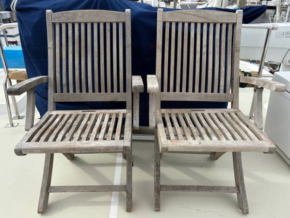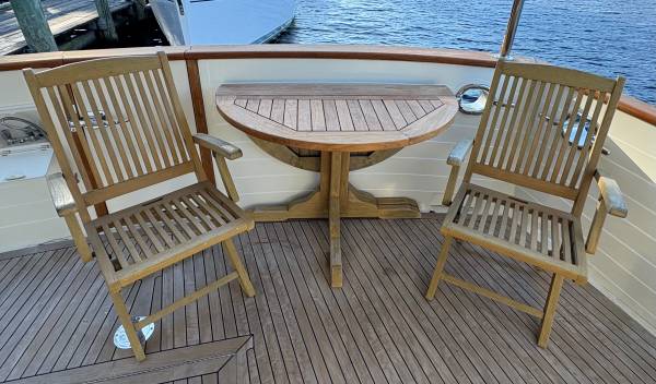 43” round teak dining table. As you can see in the picture one leaf also drops down to use against a wall as a half round. Chairs fold for storage.