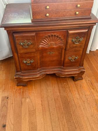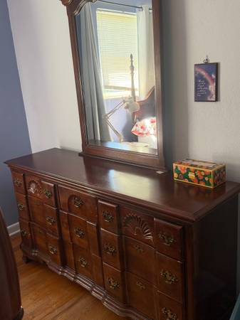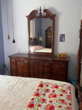Queen size Cherry Chadwick Bedroom outfit. Includes Highboy (Chest of Drawers), Dresser with mirror, nightstand, headboard, footboard, mattress and box spring.