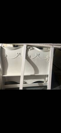 The entire set features classic French Provincial details — carved bows, roses, curved silhouettes, beaded molding, and elegant feet. Perfect for a girl’s room, guest room, shabby-chic décor, or a refinishing project.