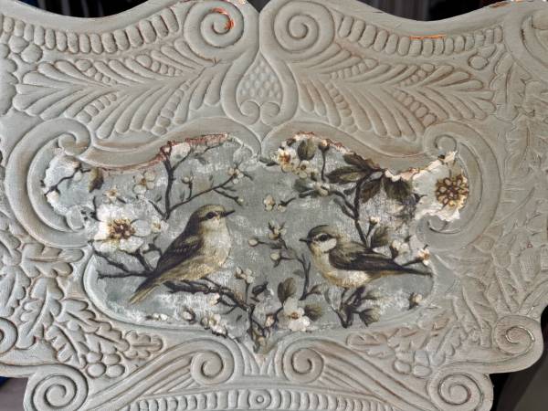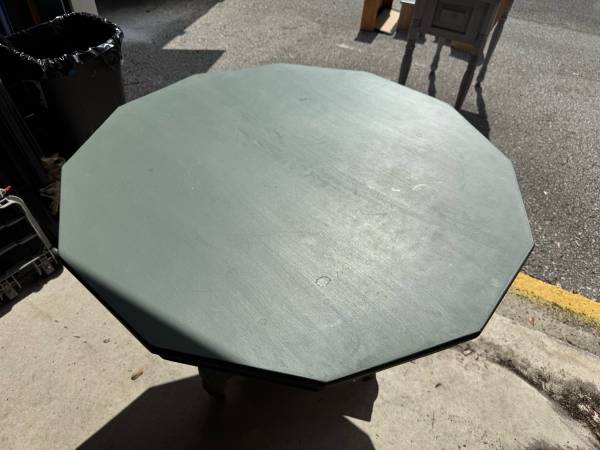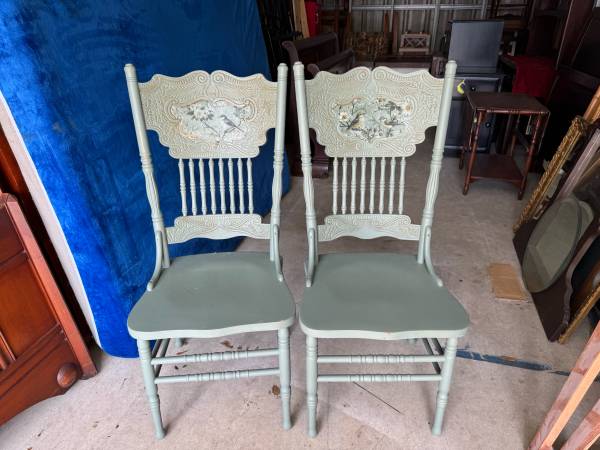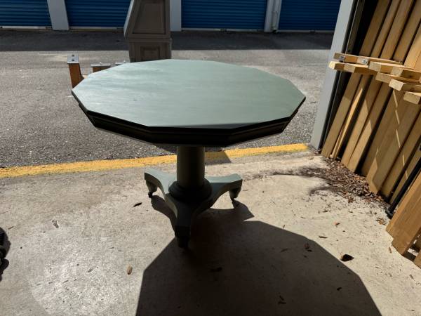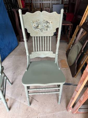 Dinette set is in very good condition… Strong and sturdy… Very minor ware… Table set was made in the 60’s… Made of oak wood… Color is sea foam green… Painted… Base has small wheels… No breaks or cracks… Chairs are sturdy with bird designs on front of the back… Bird pictures are a little worn but are still clear(pictured)… Table measures 36.5”R x 27.5”H… Chairs measure 18.5”W x 18.5”D x 42”H(back) x 18”H(seat )… All offers are considered… I meet my customers for pickups till 8pm… Delivery & set up available… I accept cash,Venmo or PayPal…