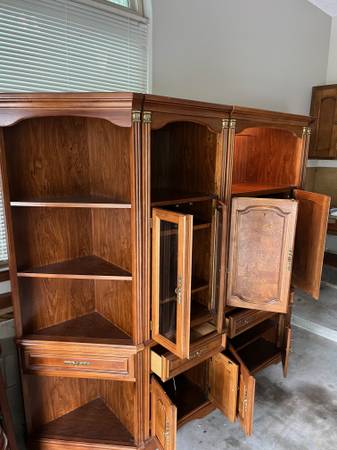dark cherry solid wood cabinet for entertainment systems has a light in one of the top cabinets good condition no damage, doors working properly 63 in wide /21 in sides on both sides 76in tall