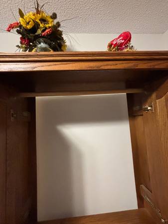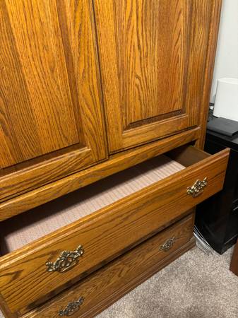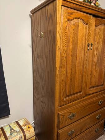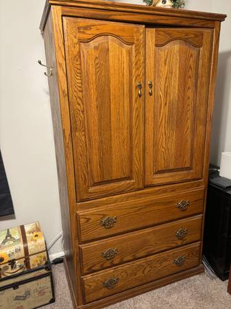 This is a three drawer armoire that was originally used as a TV cabinet and has been modified with a removable, closing rod for storage of sweaters and jackets. It is an excellent condition.