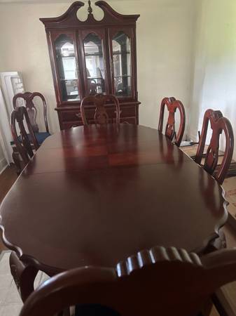 $400.00 OBO. Dark wood dining set includes- Table 78 x 42 with leaf in, without leaf 60 x 42, leaf is 18”. Six chairs, two are arm chairs, all are covered in cream colored cloth. The hutch is 7’ at the peak x 50”. The bottom cabinet is 50 x 33 1/4, with 3 doors 1 shelf inside that area and two drawers above. The upper cabinet is 46 1/2 x 38 with 3 glass and wood doors. Inside are two glass shelves that are 15” deep with a mirrored back and light. Please note that this is located in Saint Marys, GA
