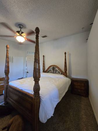 Very heavy wood bedroom suite. Headboard, footboard, dresser w/ mirror, and night stand.