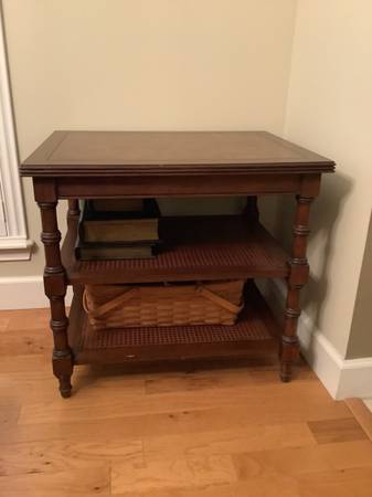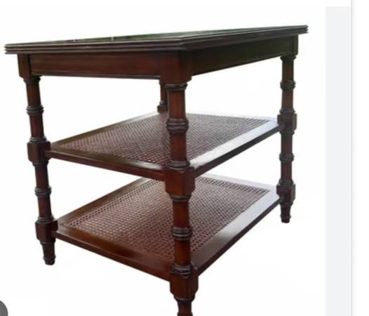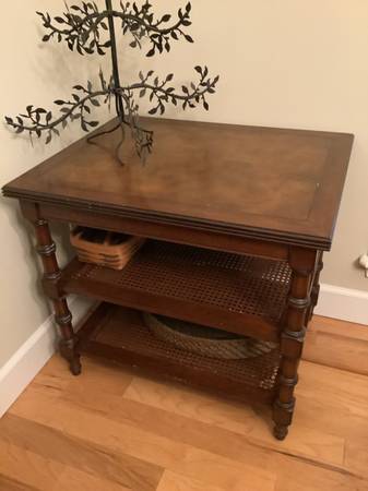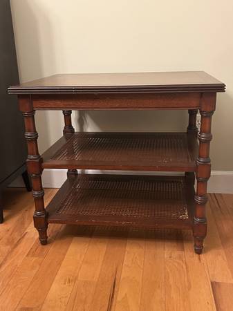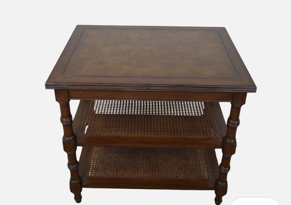 Two open shelves with cane weaving, turned tapered legs and ash burl top. (the top appears much lighter in the picture than it is in person)