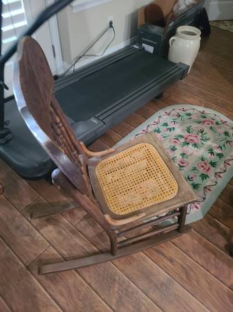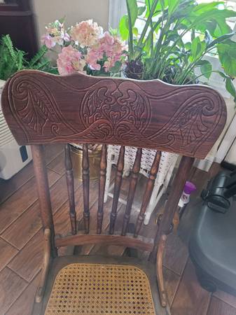 Besutiful antique oak rocking chair. With cane seat. seat is 17 inches high and 16 inches wide, back of chair is 27 inches high. Back has carving. Just reduced very comfortable. Thank you they dont...