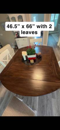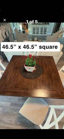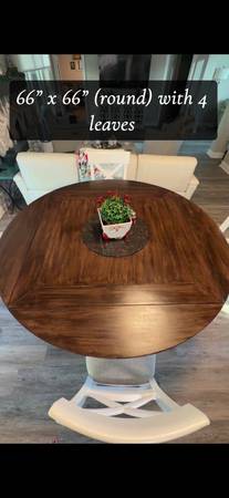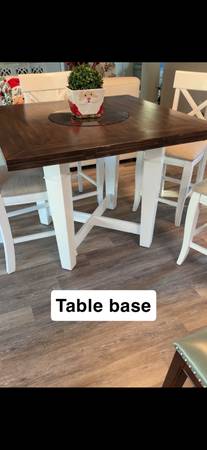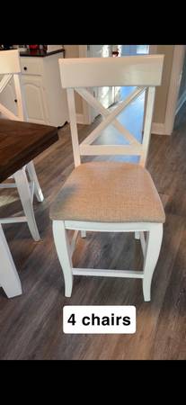 Originally Purchased at WoodChucks!! Solid counter height table and chairs. Table has a leaf on all 4 sides! Great Condition!