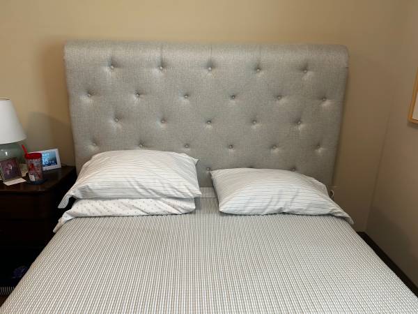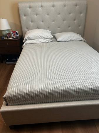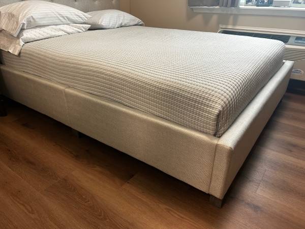 Neutral Fabric Cushioned Platform bed. No marks in perfect condition only used 18 months. Situation changed and don’t need anymore. Also have a queen mattress purchased at Costco used 18 months $100...