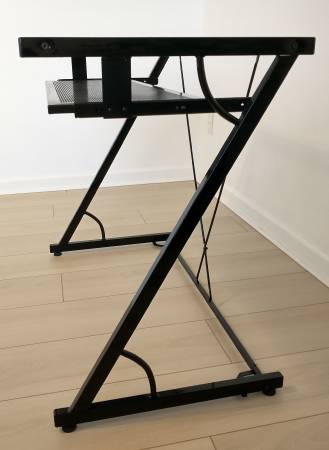 Black metal frame desk with glass top and pull-out metal keyboard tray