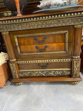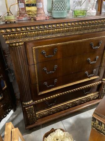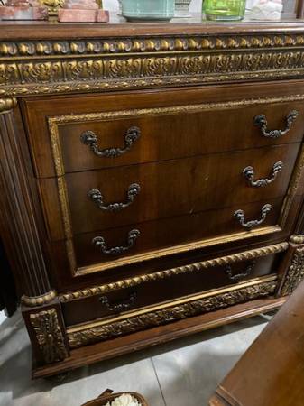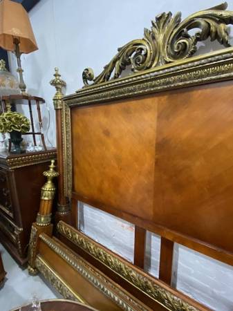 Polaski Bellisimo Empire Style bedroom set made of birch hardwood, Mahogany finish, and decorative gilt golden details.