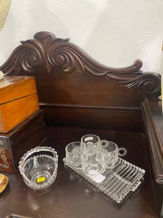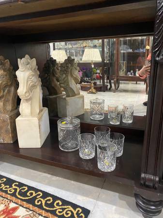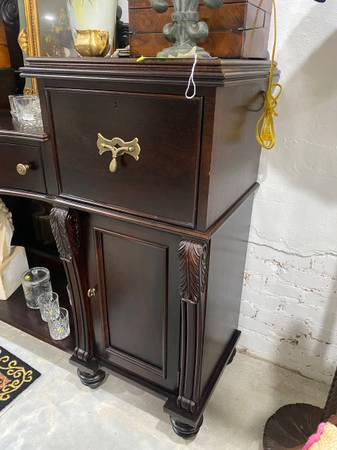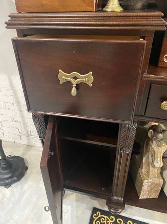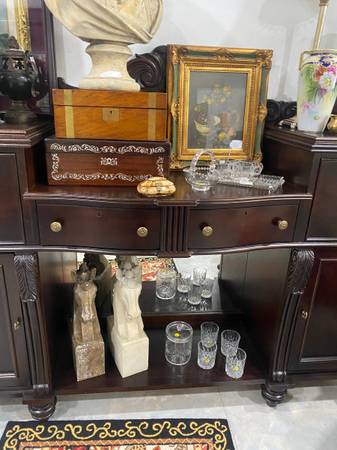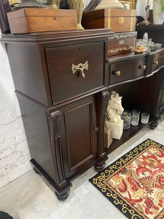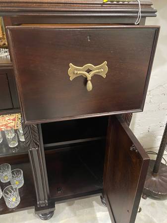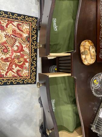 Stanley furniture was unique in its offerings. Getting harder to find these original pieces. This buffet is new with plenty of shelves and drawers to accommodate kitchen storage. Also has two center drawers with jewelers felt to buffer bar tools from scratching or to protect silver. Top molding was accidentally cracked and repaired. Mirrored center is a great centerpiece, bottle or vase display.