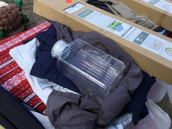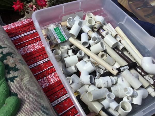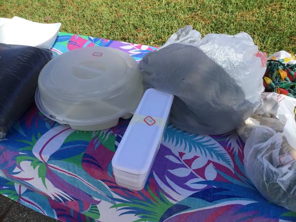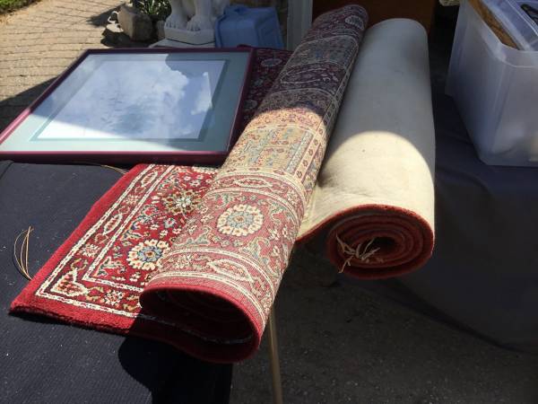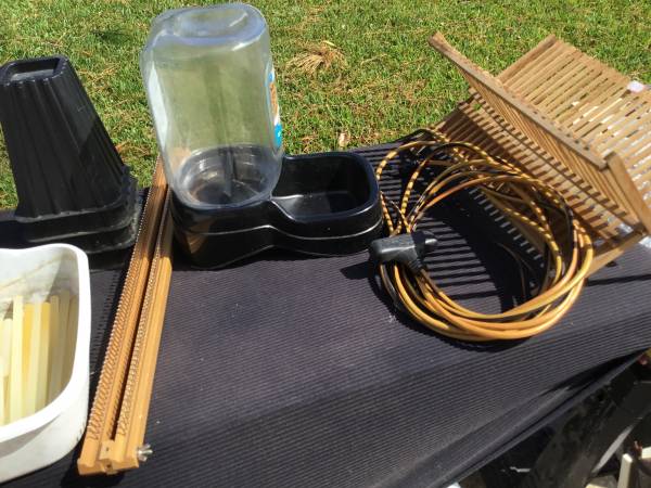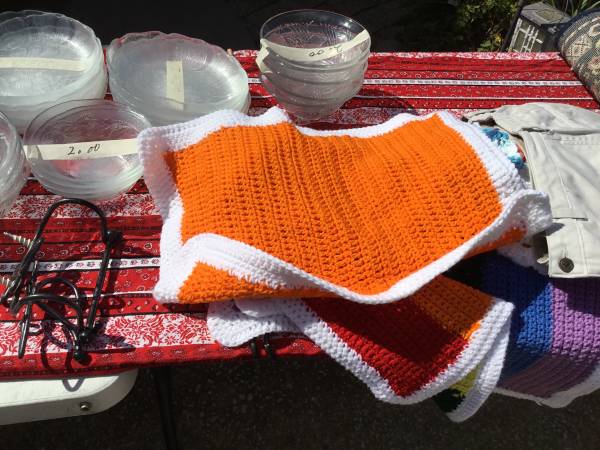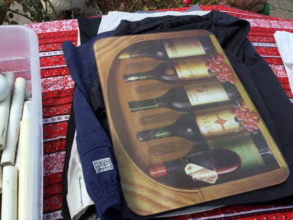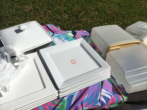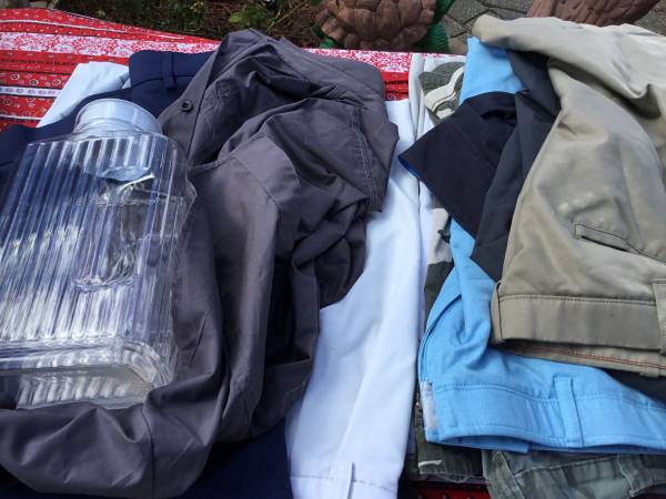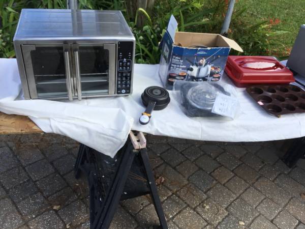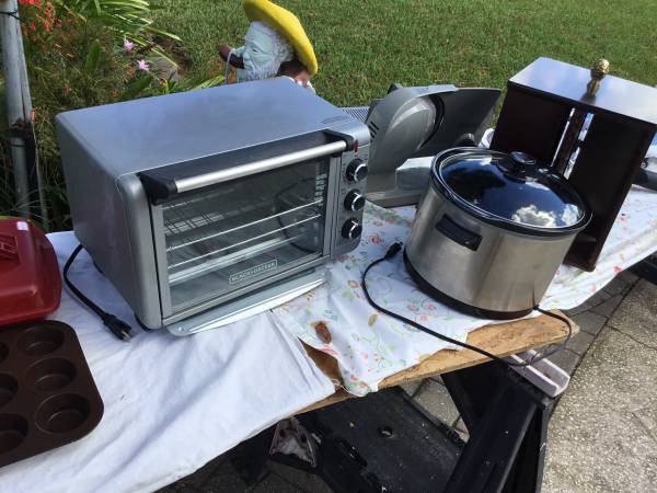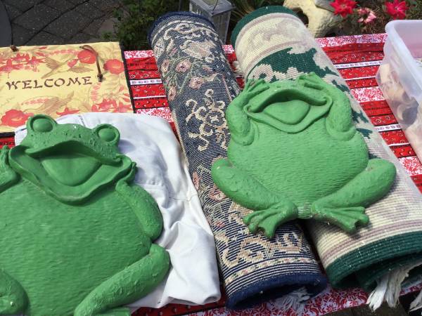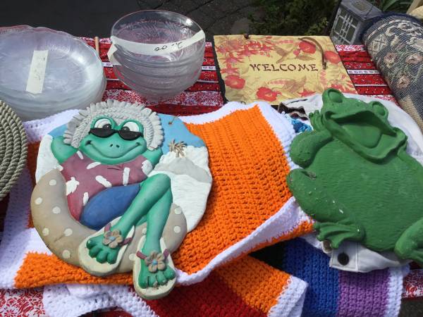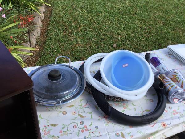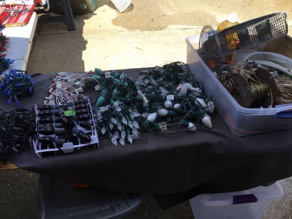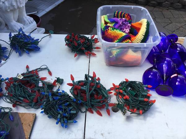 Garage sale. Something for everyone Xmas light plant Tables pot and pan