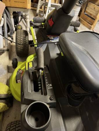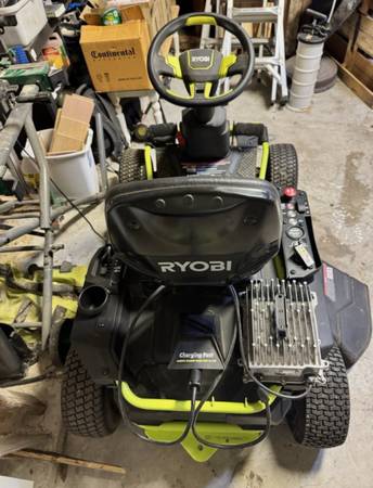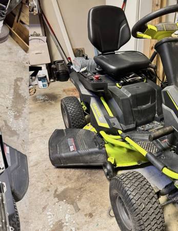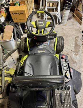 Introducing the Ryobi RM480ex riding lawn mower, perfect for your lawn care needs. This mower features a powerful battery source and includes a battery for convenient usage. The model has a cutting width of 38 inches and includes side discharge for efficient cutting.
