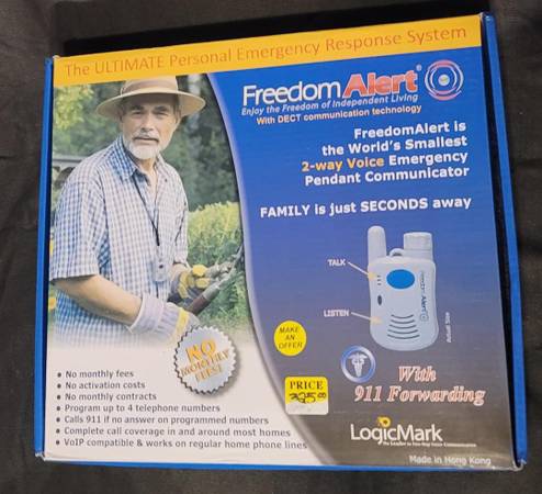 Freedom Alert Personal Emergency Response System. The Ultimate Personal Emergency Response System. The world’s smallest 2-way voice Emergency Pendant Communicator. With 911 Forwarding. No monthly fees. No activation costs. No contracts. Program up to 4 telephone numbers. Calls 911 if no answer on programed numbers. VOIP compatible & works on regular phone lines. Made by Logicmark in Hong Kong. Enjoy the freedom of independent living with DECT communication technology. Model # 3551Comes with walkie talkie and pendant. System Tests and battery test functions. Extra telephone jack in base for regular phone if extra jack is needed. Up to 4 pendants can be programmed to operate one base unit. Auto power off after 1 minute of inactivity. Answer an incoming phone call with pendant. With 911 forwarding a friend or family member can simply dial 911 from their phone while still on the line. The unit will then automatically hang up and dial emergency services. Pendant is water resistant. Supervised voice prompts.Cash Only. No Cash App. No Venmo. No Zelle.