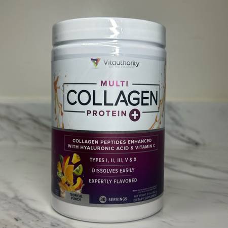 The product is a multi-collagen peptides supplement with added hyaluronic acid and vitamin C, designed for metabolism support, women's health, hair, skin, and nail health, as well as joint support. It comes in a pack of 30 servings with a tropical punch flavor and is suitable for adult females. The product is non-GMO, gluten-free, dairy-free, and free from artificial colors, with natural ingredients like collagen types I, II, III, V, and X, as well as protein. It comes in a powder form and is packaged in a 9.9 fl oz container with standard packaging. *Expires-1/2026*