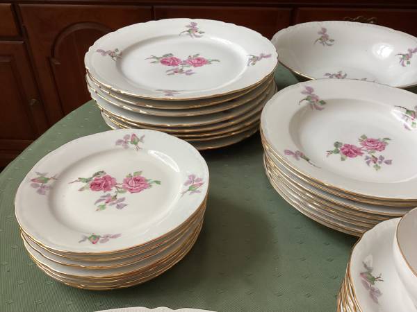 Fine Bohemian China made in Czechoslovakia with scalloped gold rim. Like new condition. Purchased at Macys Czechoslovakia circa 1990: 8 dinner plates 8 bowls 8 cake plates 8 cups and saucers Sugar...