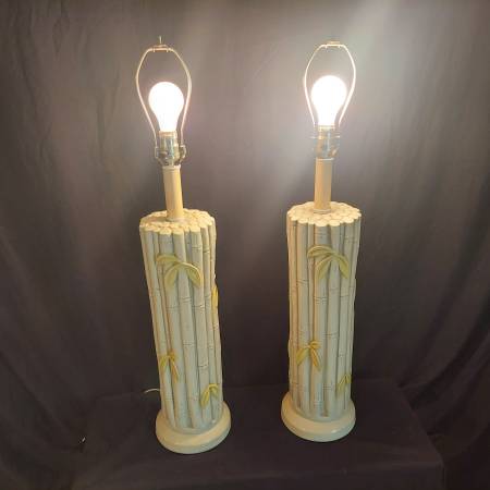 Pair of Mid Century Hollywood Regency Style Chalkware Faux Bamboo OFF White Pale Yellow Leaves Table Lamps - Palm Beach Chic Coastal, Tropical - Very Good Original Condition - May Be Some Imperfections Due to Age and Use - No Shades Included. From Non Smoking Home. Measures 7" Base x 27 1/2 to Top of Socket Tall. Price $300.00. Cash Only. For More Info Call 386 eight four eight six two two 4 or Texts.