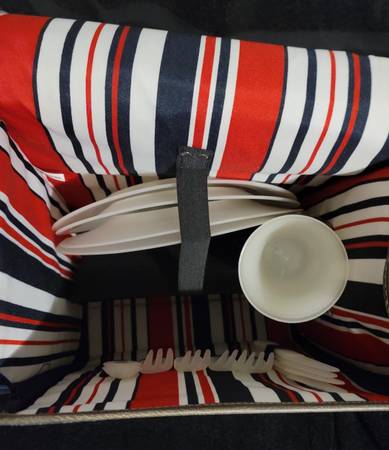 Green Picnic Tote Closed With Utensils. Plenty of room for food & wine. Includes shoulder strap for ease of carrying. 14 pieces of utensils that include 4 plates, 4 knives, 4 forks and 2 spoons. Measures 12” W X 14” H.