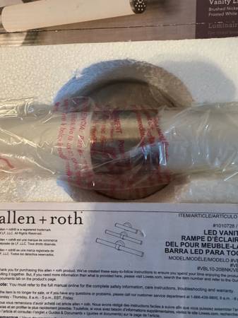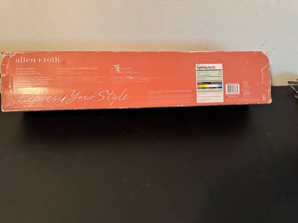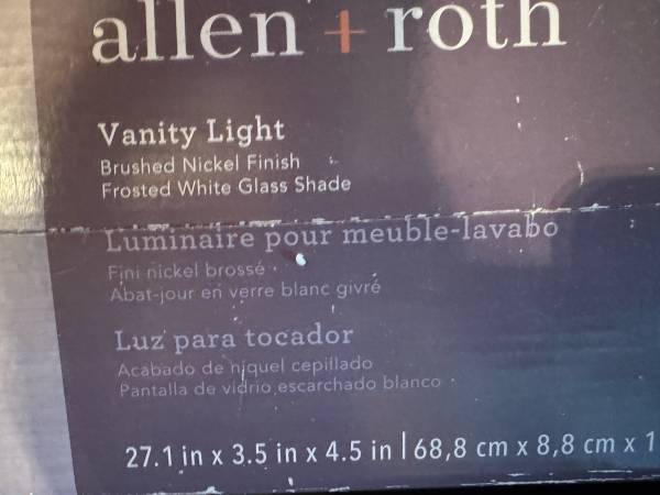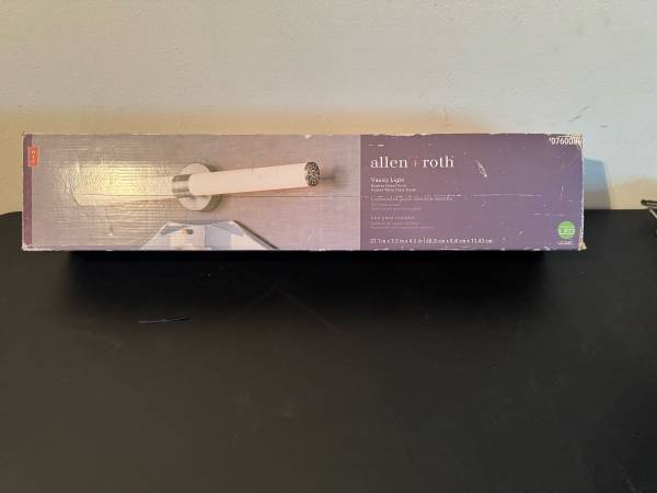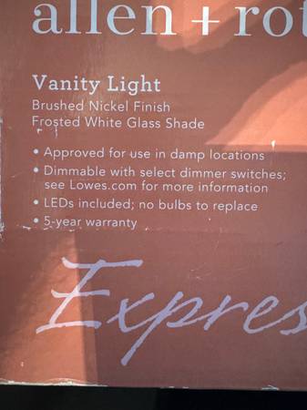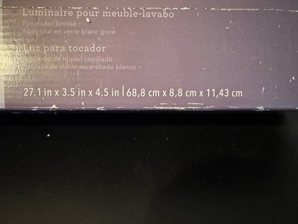 Fixture is new in the original box… Hardware & instructions included… 27.1” long… Brushed nickel… Frosted glass… Approved for damp locations… LED included… No bulbs needed… Uses 120v house current… Lamp measures 27.1” x 3.5” x 4.5”… All offers are considered… I meet my customers for pickups till 8pm… I accept cash,Venmo or PayPal…