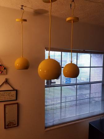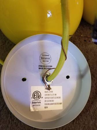 Set of 3 hanging lights are new... One Lamp has a black mark from packing that has been cleaned off… Indoor use only... Ceiling bracket needed… Runs on 120v house current... Straight wired or plug can be attached... Lamp hangs 24"... Rated up to 100wt bulb... All offers are considered... I meet my customers till 8pm...