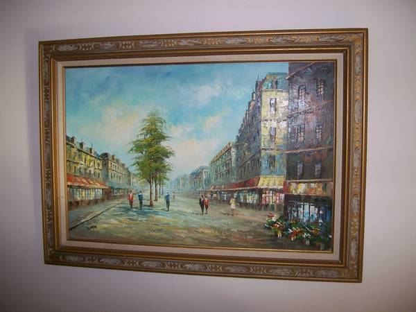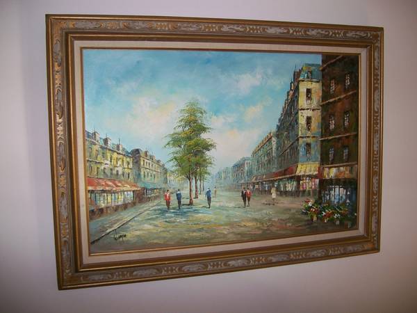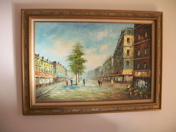 Paris street scene impressionist-style oil painting on canvas. Nice work of art for home or office. Signed: “W. Gaton.” Dimensions: 31-1/2” x 43-1/2”, including frame.