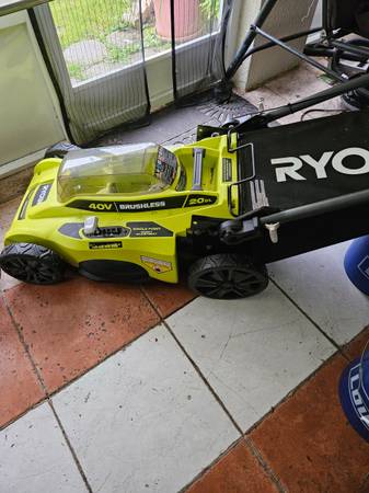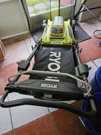 Ryobi 40V HP Brushless 21-inch Cordless Lawn Mower in excellent condition with minimum wear. The item includes rear bagger and battery that need repair, and charger.