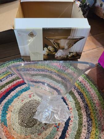 Beautiful large shannon crystal centerpiece bowl with frosted Roses on the base. Vintage item 14 inch 24 % crystal bowl. Never used still in original box, great for gifts. Or use for flowers candy...