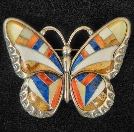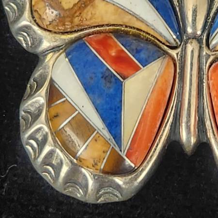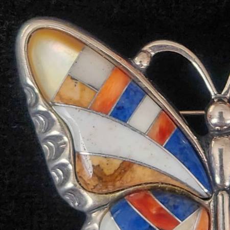 Signed Brooch By Carolyn Pollack Features Multi-Stone Mosaic Inlay Inlay Of Butterfly: Gemstones of Lapis, Coral, Mother Of Pearl, Sandstone Sterling Silver Excellent Pre-Owned Condition 2 Inches By...