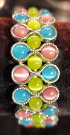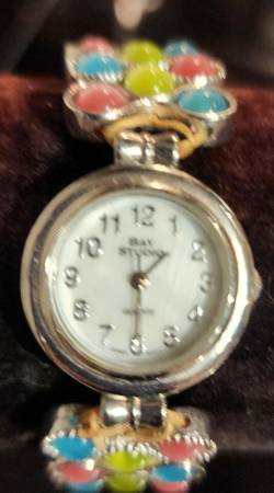 Bay Studio Watch with Mother of Pearl Round Dial. With pink blue and green round stones. Silver tone bezel and expandable band. This watch needs a battery.